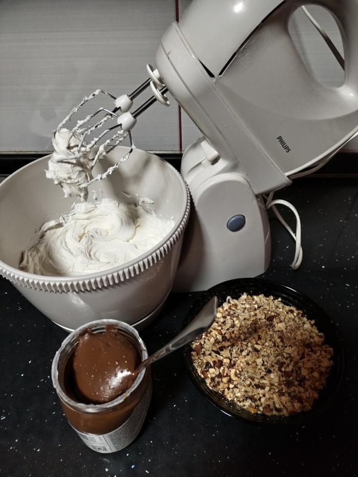 Za fil umutite mascarpone, dodajte Nutellu i seckane lešnike.