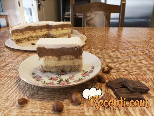 Hladan puding izmiksati, pa polako dodavati prethodno umućen omekšali margarin. Dobro umutiti mikserom, da se dobije kremasta smesa. Krem podeliti na dva jednaka dela. U jednu polovinu krema dodati mlevene lešnike i umutiti. U drugu polovinu krema dodati otopljenu i ohlađenu čokoladu i dobro umutiti.