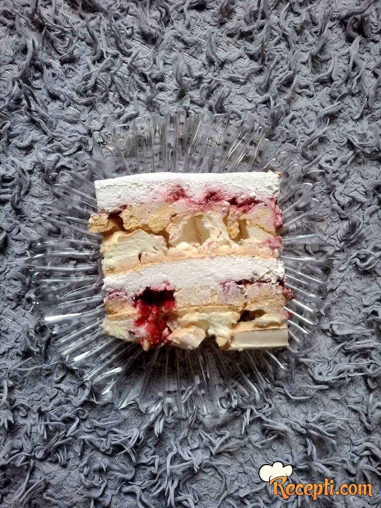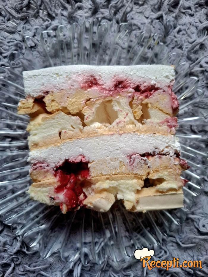 Umutiti belanca, dodati šećer u prahu i nastavite sa mućenjem dok ne postanu čvrsta. Dodati sirće i još malo mutite. Smesu rasporedite u veliki pleh od rerne (44x32 cm) obložen papirom za pečenje. Staviti da se suši u rernu zagrejanu na 170°C. Kada stavite u peć smanjite na 130°C i sušite oko 2 h. Rernu isključite, otvorite malo vrata rerne i ostavite da se postepeno ohladi. Vreme sušenja i temperatura svakako zavisi od jačine vaših grejača. Ohlađenu koru preseći da se dobiju dve kore 22×32 cm.