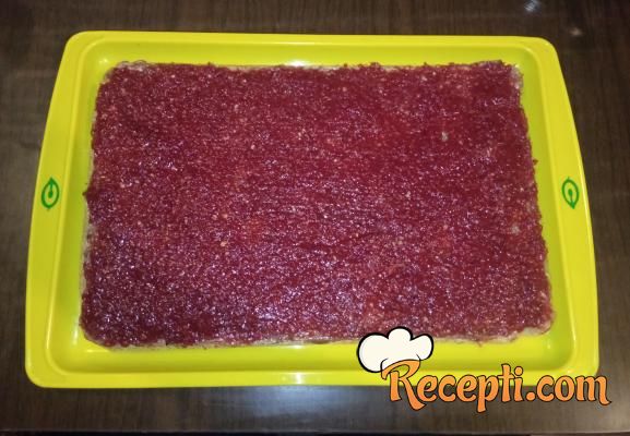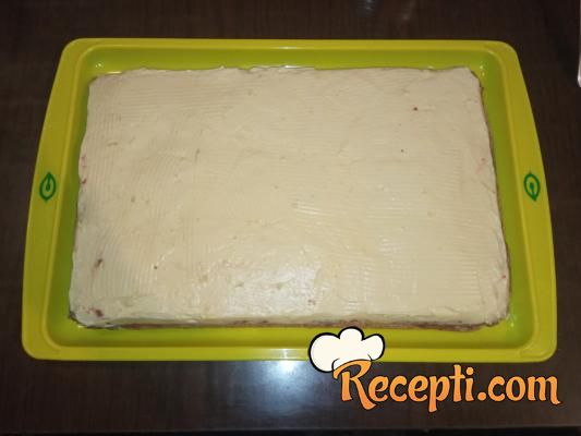 Na tacnu postaviti prvu koru, premazati sa 3-4 kašike eurokrema....