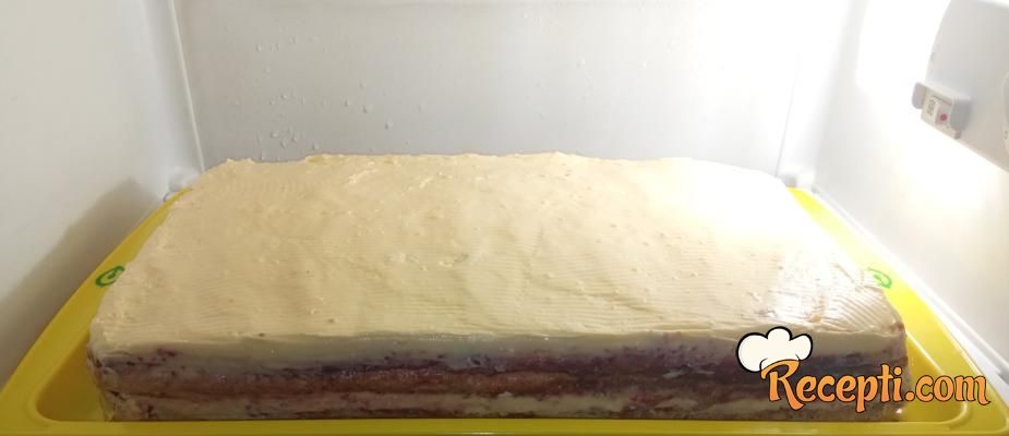Ponoviti postupak sa preostalim sastojcima (druga kora, eurokrem, lešnici, druga polovina fila od malina, druga polovina fila od vanile). Tortu ostaviti u frižideru da se stegne.