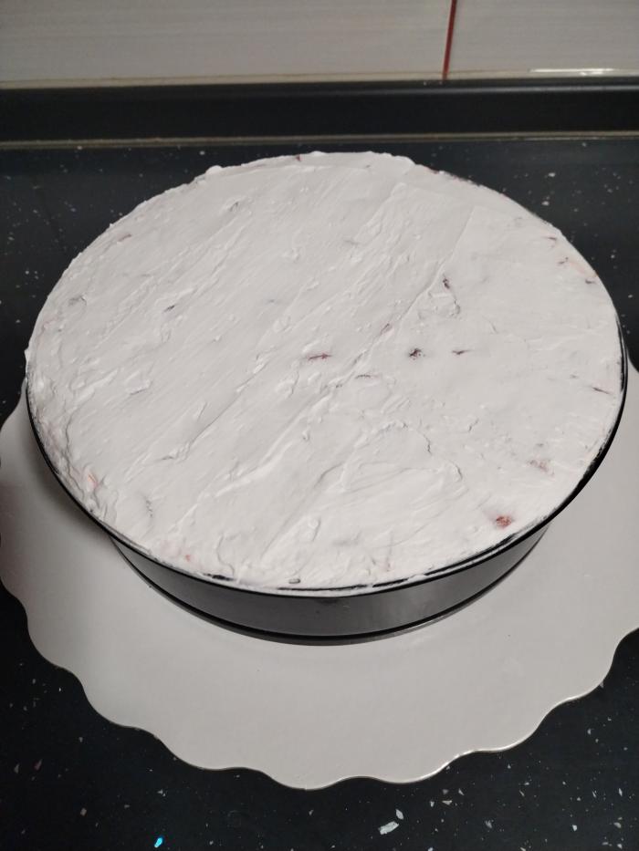 Postupak slaganja torte: svetla kora koju je potrebno preliti sa malo toplog mleka, a potom je premažite sa džemom od jagoda.