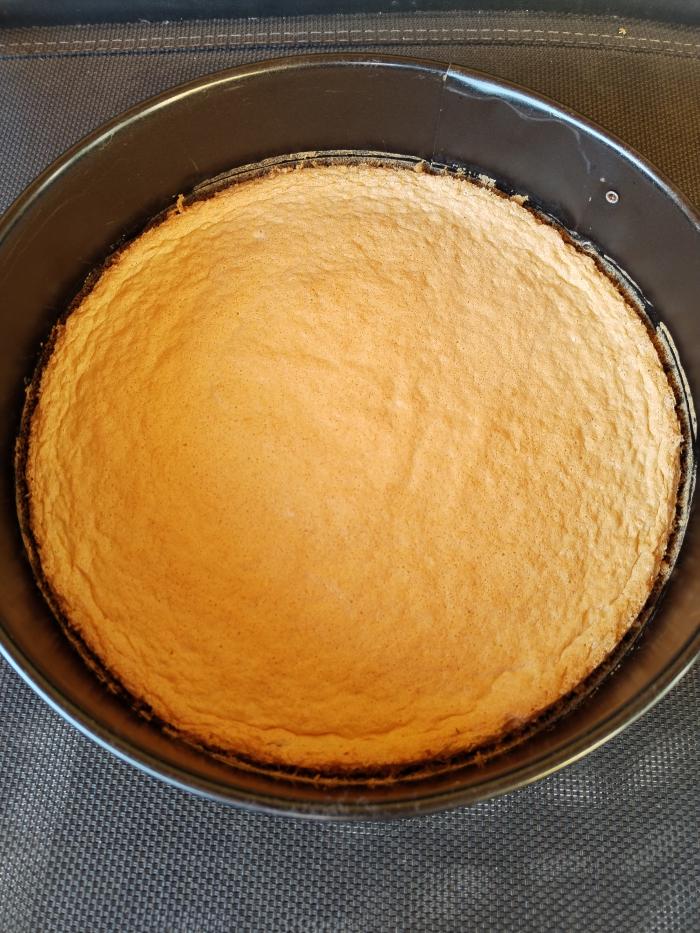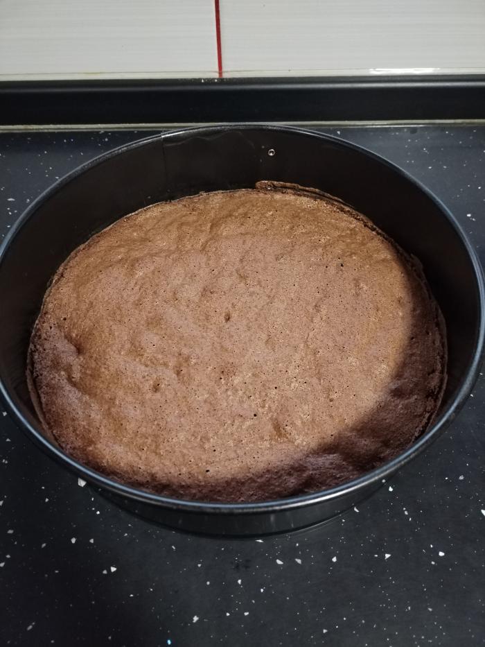 Za tamnu koru razdvojte belanca i žumanca pa belanca penasto umutite sa šećerom. Zatim dodajte jedno po jedno žumance i dalje muteći. Brašno pomešajte sa praškom za pecivo, pa polako umešajte u prethodnu smesu mešajući varjačom. Dodajte kakao pa dobro sjedinite. Smesu izlijte u okrugli pleh obložen papirom za pečenje.