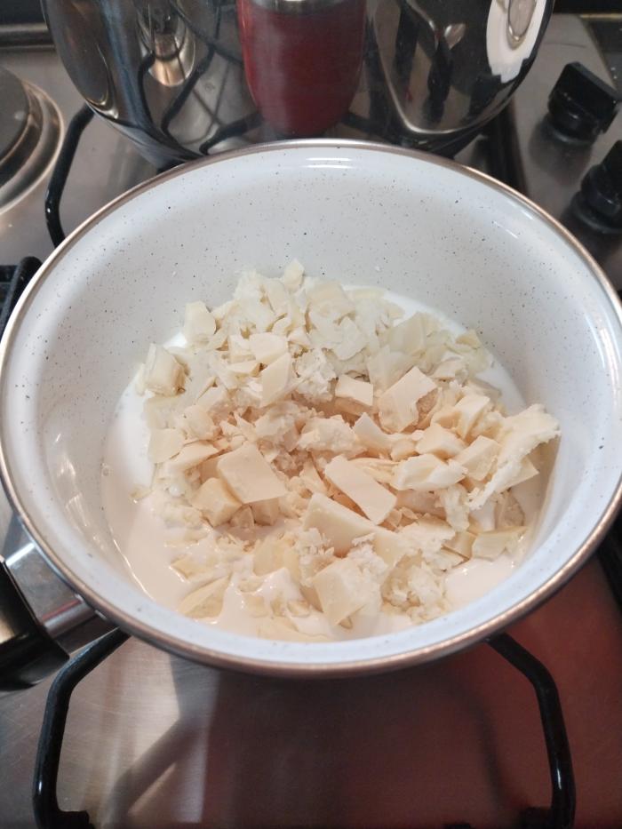 Za beli fil, slatku pavlaku umutite sa šećerom u prahu i podelite na dva jednaka dela. Za ganaž ugrejte slatku pavlaku pa dodajte belu čokoladu izlomljenu na sitne kockice i mešajte dok se čokolada skorz ne otopi.