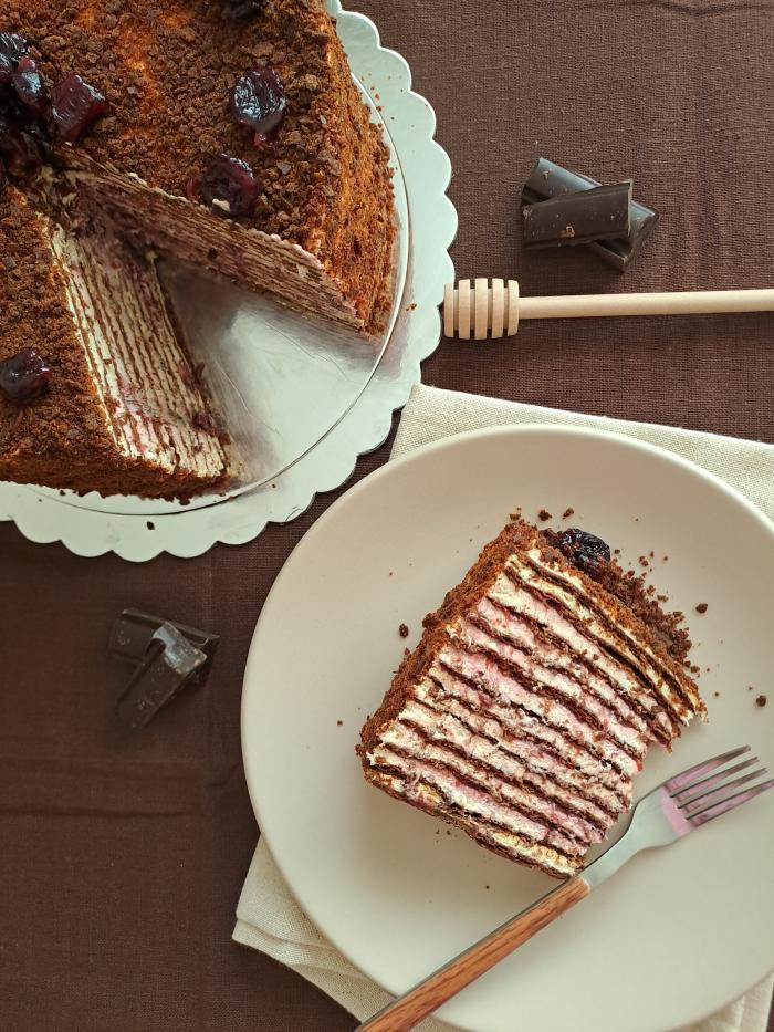 Slaganje torte: Beli fil podelite na 11 delova, a fil od višanja na deset. Na tacnu za tortu nanesite na sredinu malo belog fila, koliko da se prva kora zalepi i fiksira. Stavite obruč za tortu, a zatim i acetatnu foliju. Ja sam razmereni deo belog fila sipala u dresir kesu i njom nanosila ravnomerno po kori, a zatim samo malo poravnala. Preko stavite deo fila sa višnjama. Onda stavite koru, blago pritisnite, pa nastavite sa korama i filovima naizmenično dok ne stignete do poslednje kore. Na nju nanosite samo beli fil.