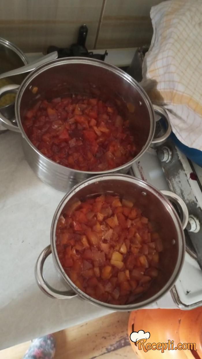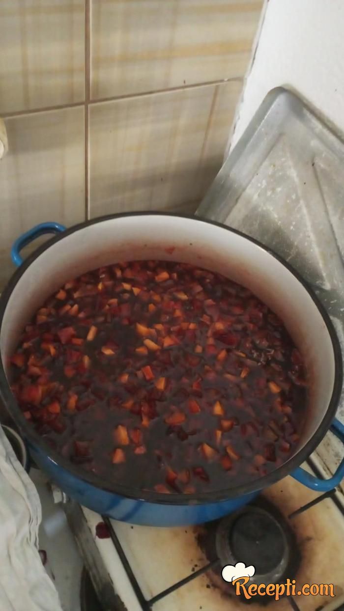 Punjenje tegli. Vruće slatko sipati u tople, sterilne tegle. Odmah zatvori i obrnuti ih naopako na 5 minuta, zatim ih vrati uspravno i ostavi da se ohlade.